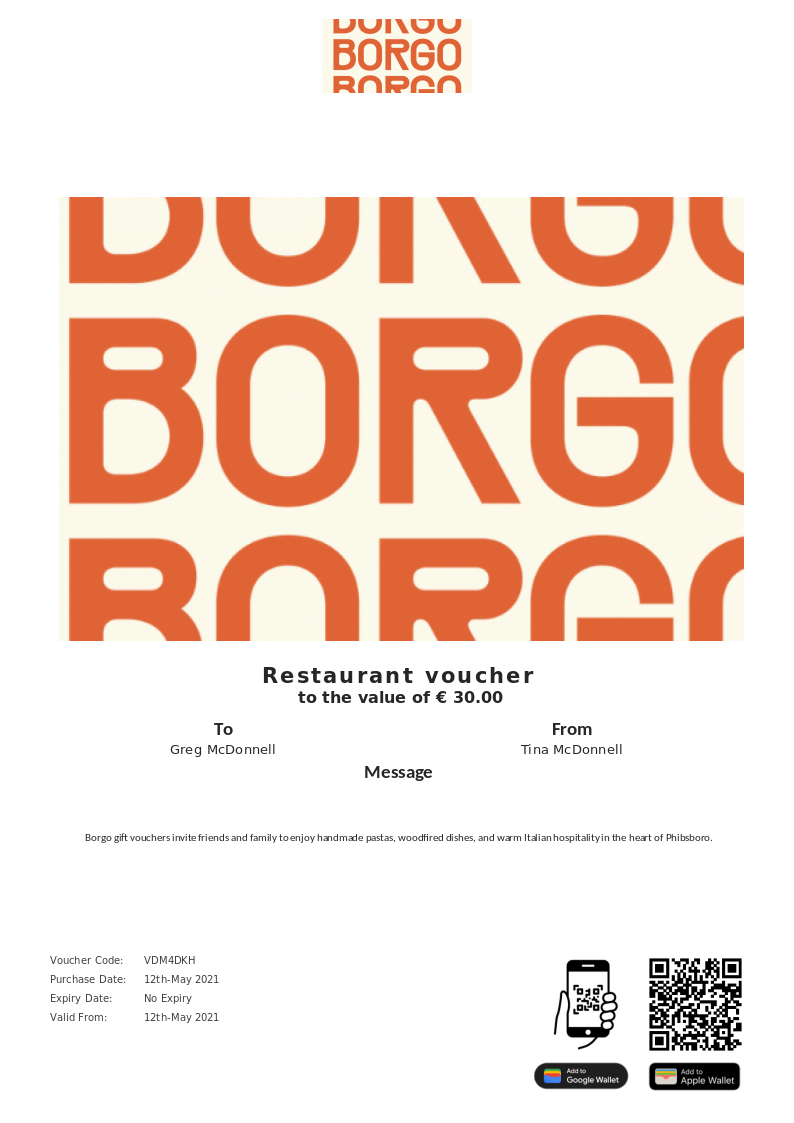 BORGO allows you to purchase instantly printable gift vouchers, special offers and tickets using the Voucher Connect platform.